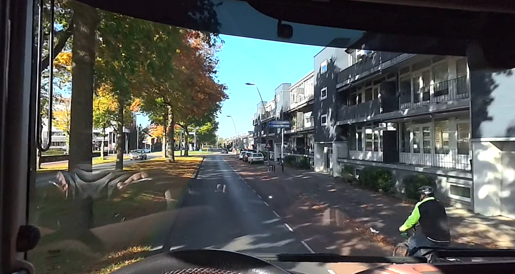 B. Bewegend beeld, waarbij je in de cabine achter het stuur zit en een route rijdt. Daarbij geeft de voice-over de aandachtspunten aan. De 3D opname maakt mogelijk dat je de omgeving, spiegels e.d. links en rechts goed kunt zien.